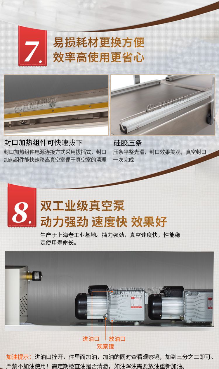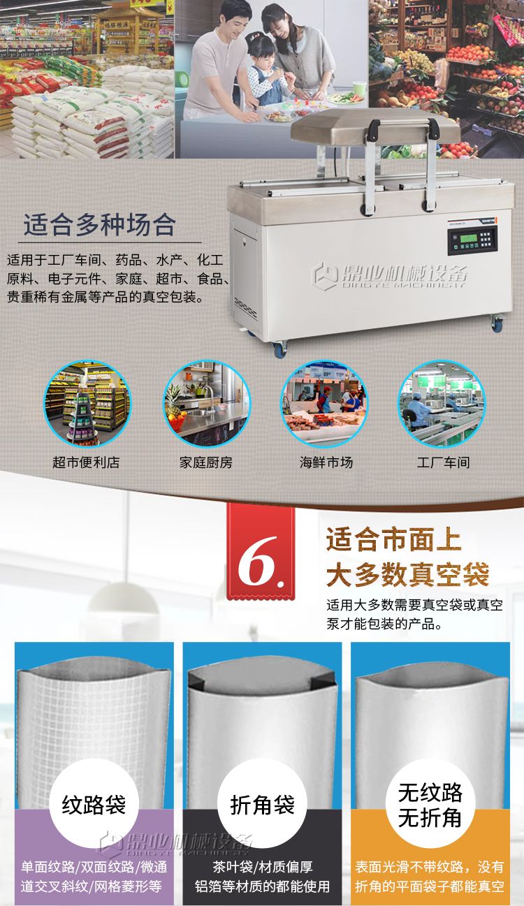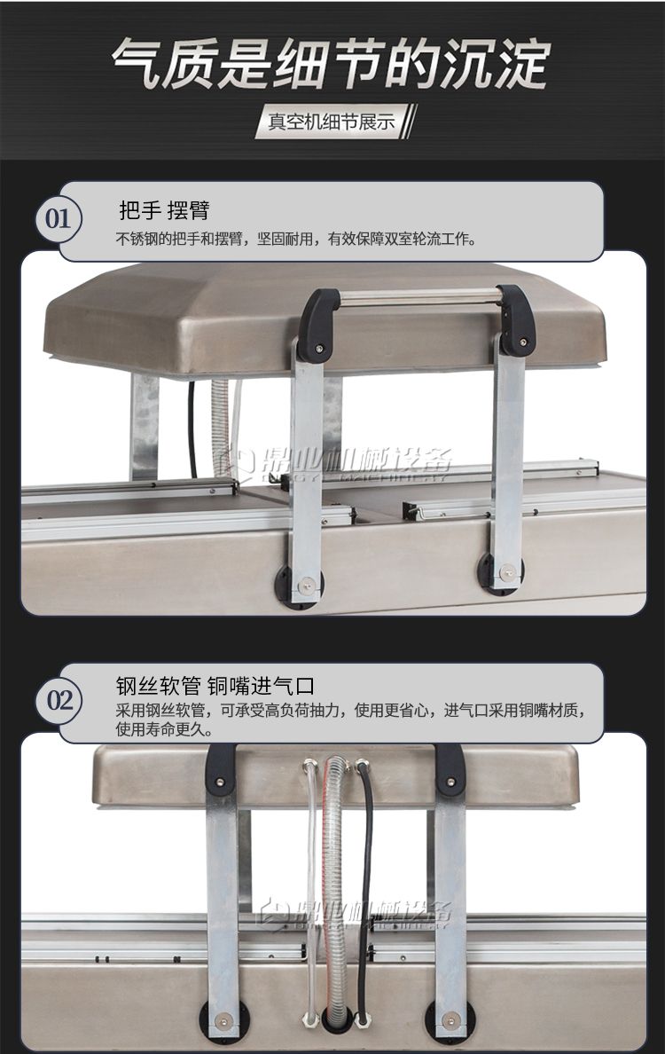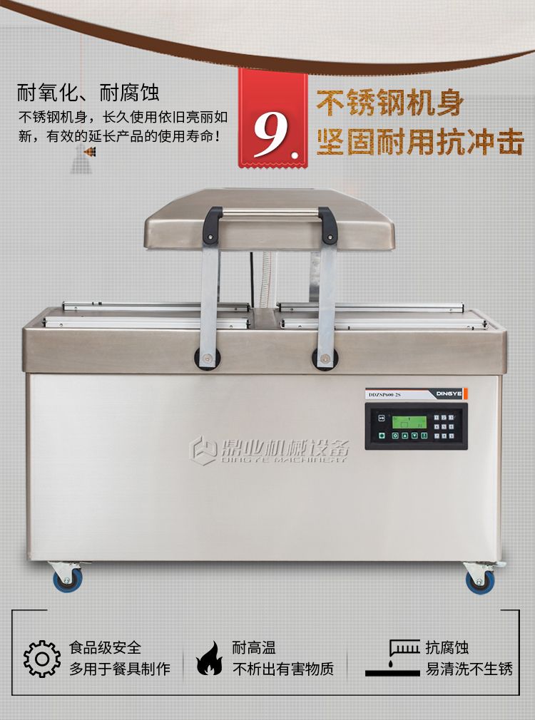 双室真空包装机,抽真空保质保鲜,一机双仓,效率翻倍。双室真空,当左侧真空室在抽真空时,右侧可放置产品来进行操作,左右两边交替操作使用。