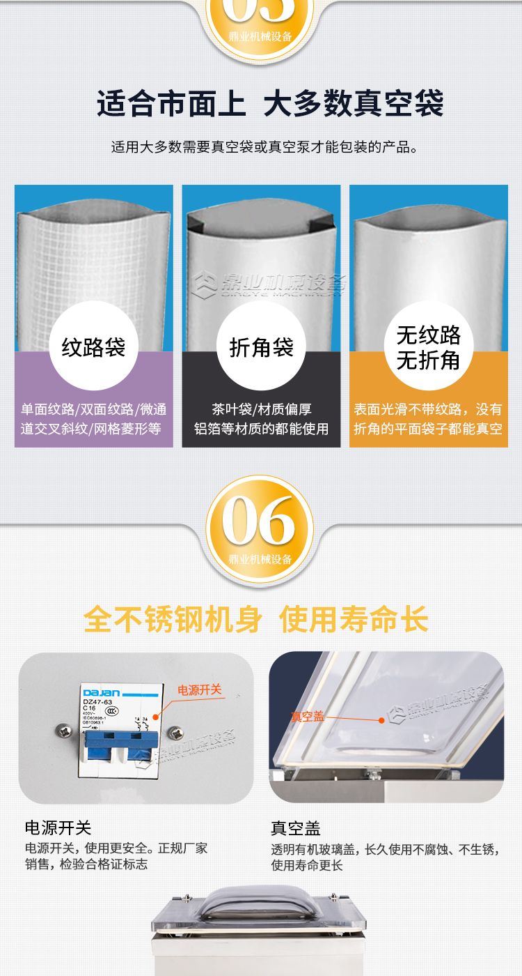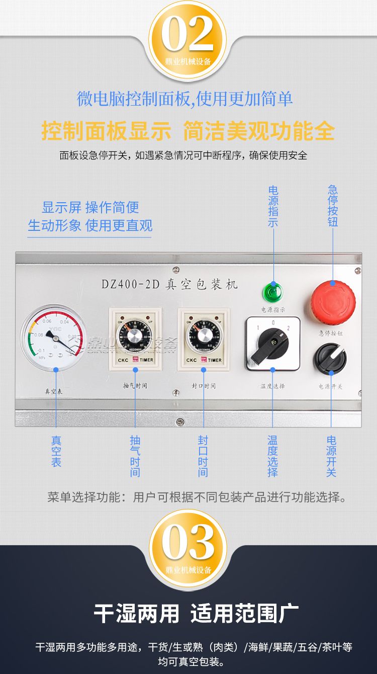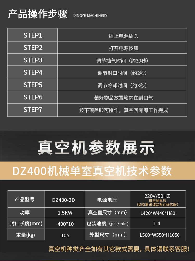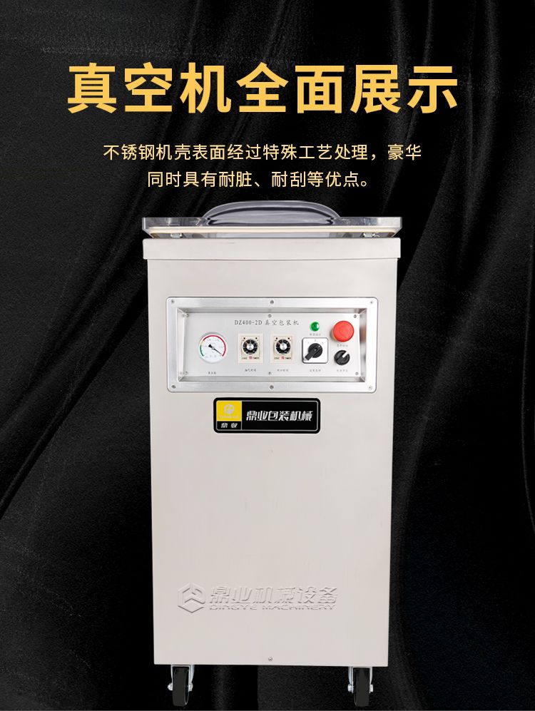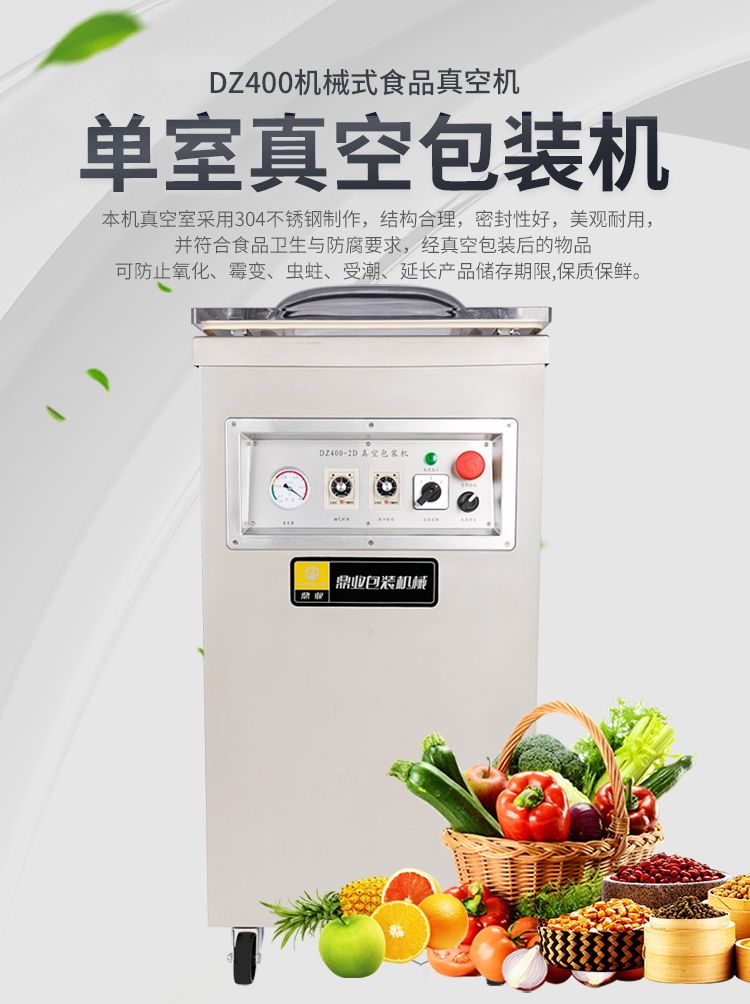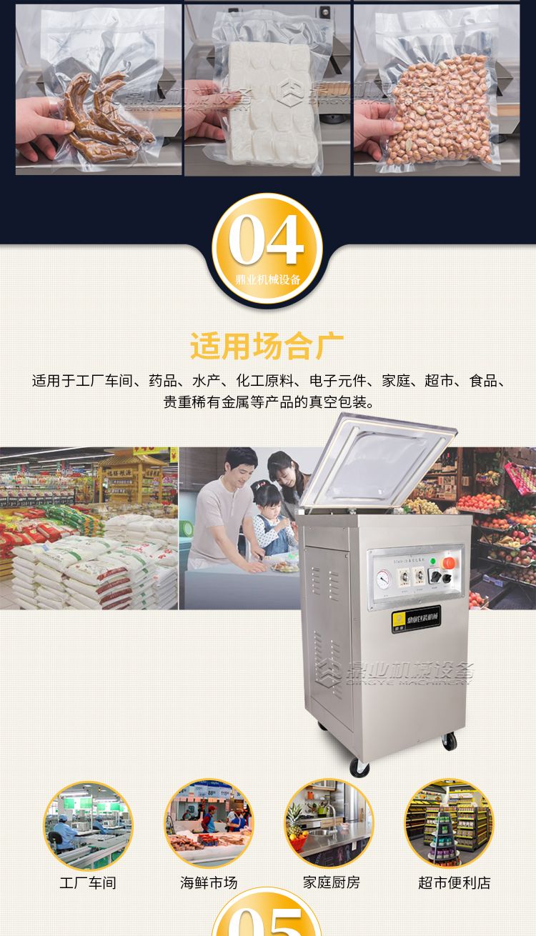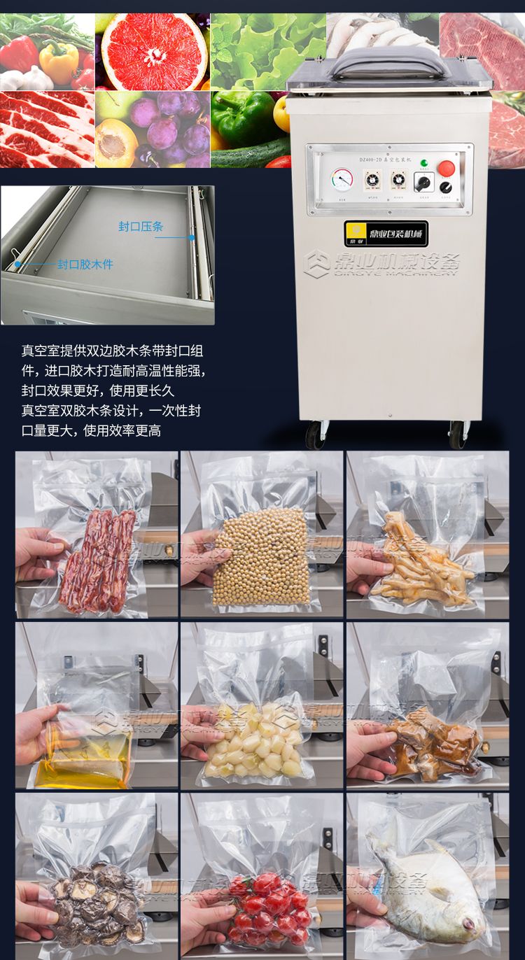 此单室真空包装机适用于食品行业,药品行业,五金电子元件行业,水特产行业,化工原料行业等产品真空包装,具有抽空力强,封口包装速度快。