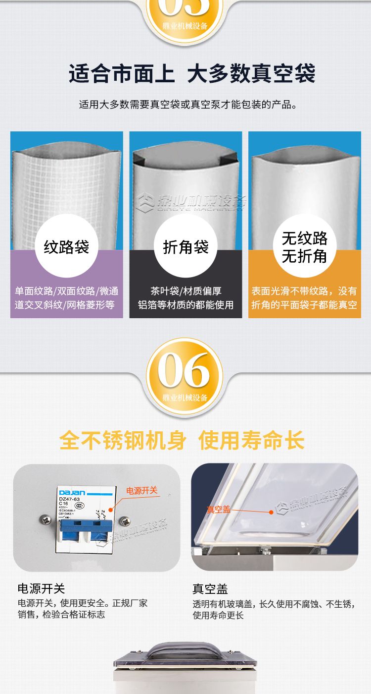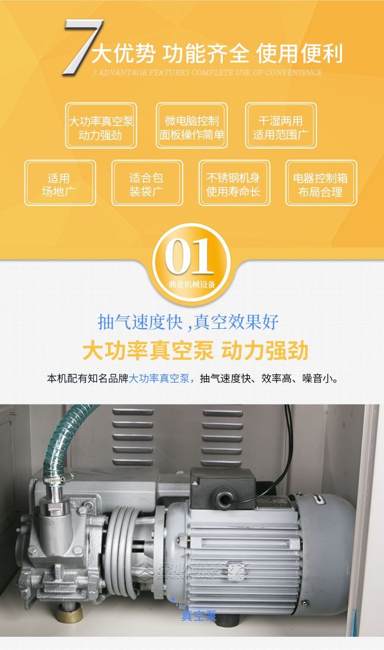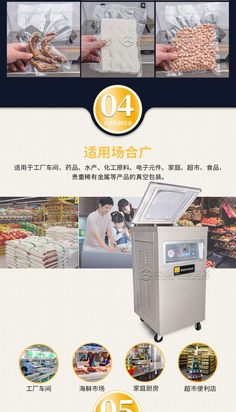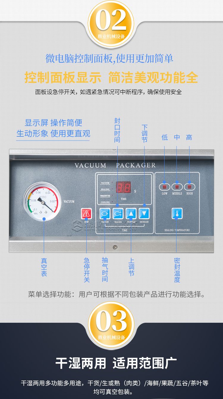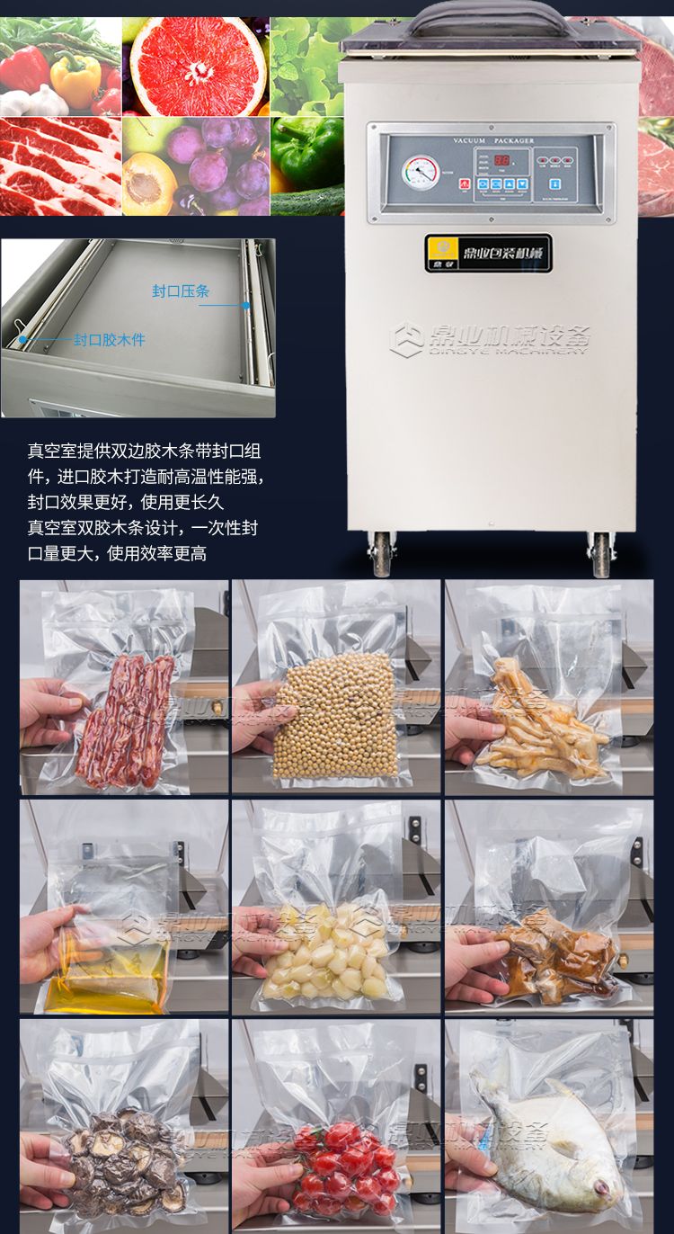 本系列真空包装机具有抽真空、封口、印字一次性完成的功能。适用于食品、药品、水产、化工原料、电子元件等产品的真空包装;可防止产品的氧化霉变、防腐防潮、可保质保鲜,延长产品的储存期限。