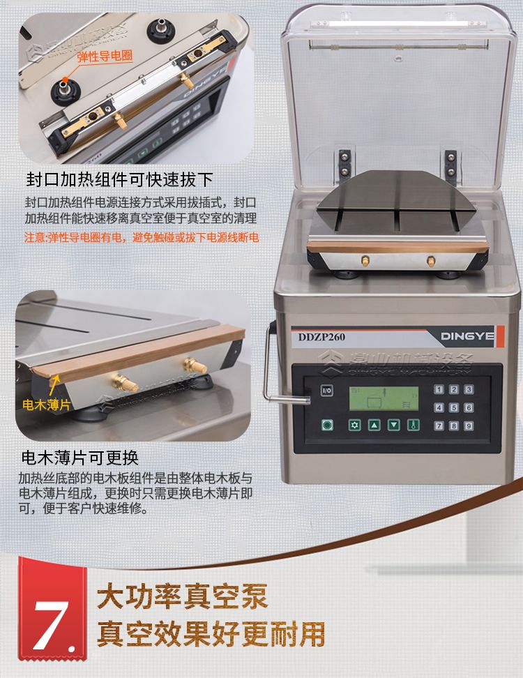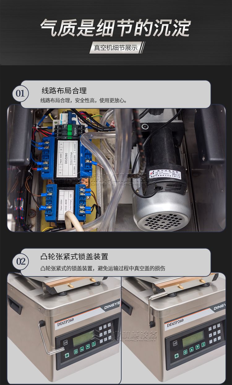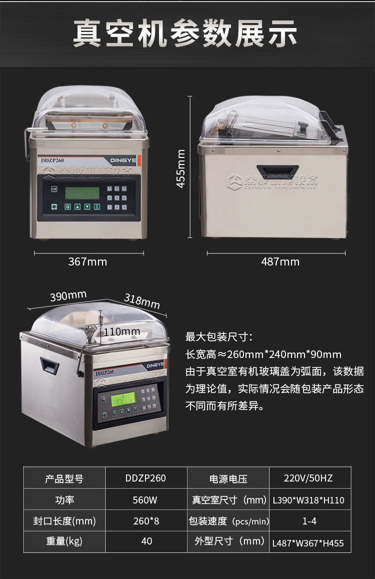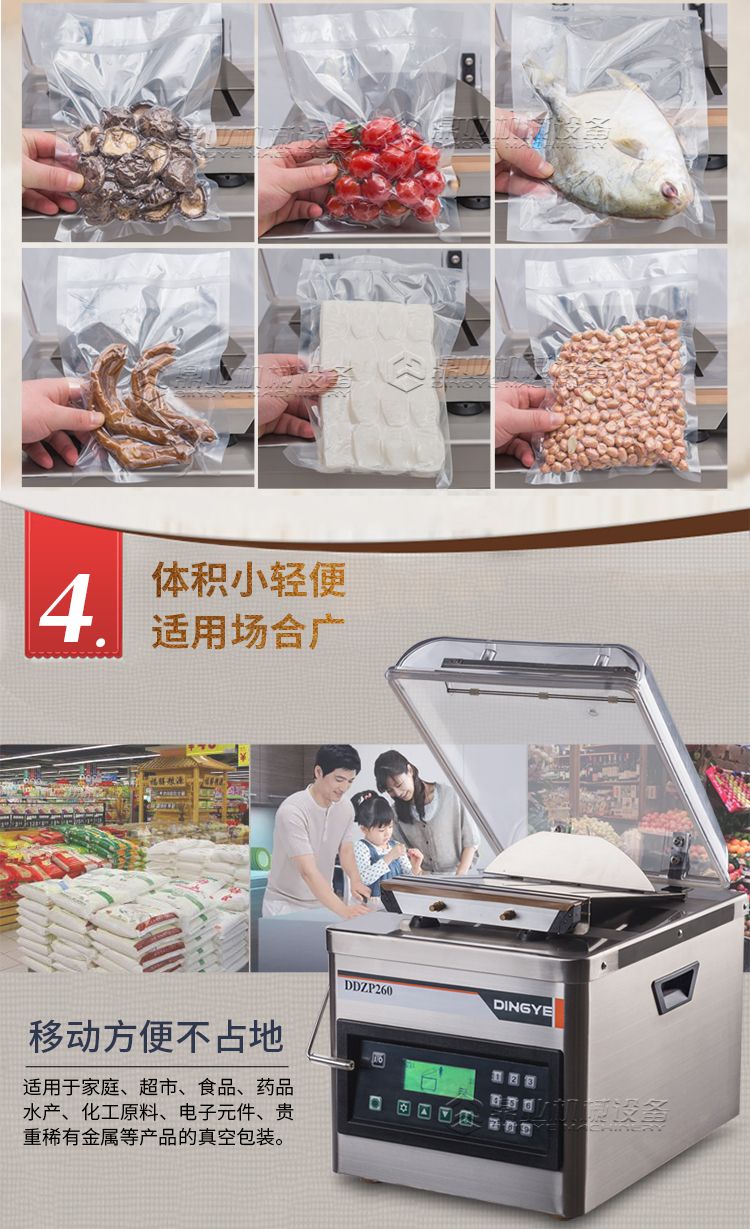 DDZP260真空机适用如:肉类加工、酱腌产品、水产、海产品加工、蔬菜加工、农副产品加工、果脯、粮食、豆制品、药材、电器、化学制品等颗粒、粉状、液体等食品进行真空后充惰性气体包装、可以防止产品氧化霉变、腐败、防潮达到延长产品的储存期限。