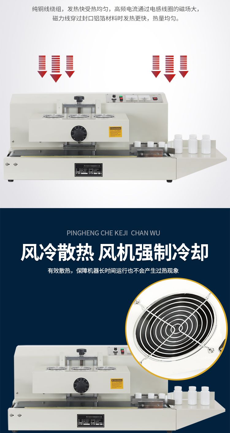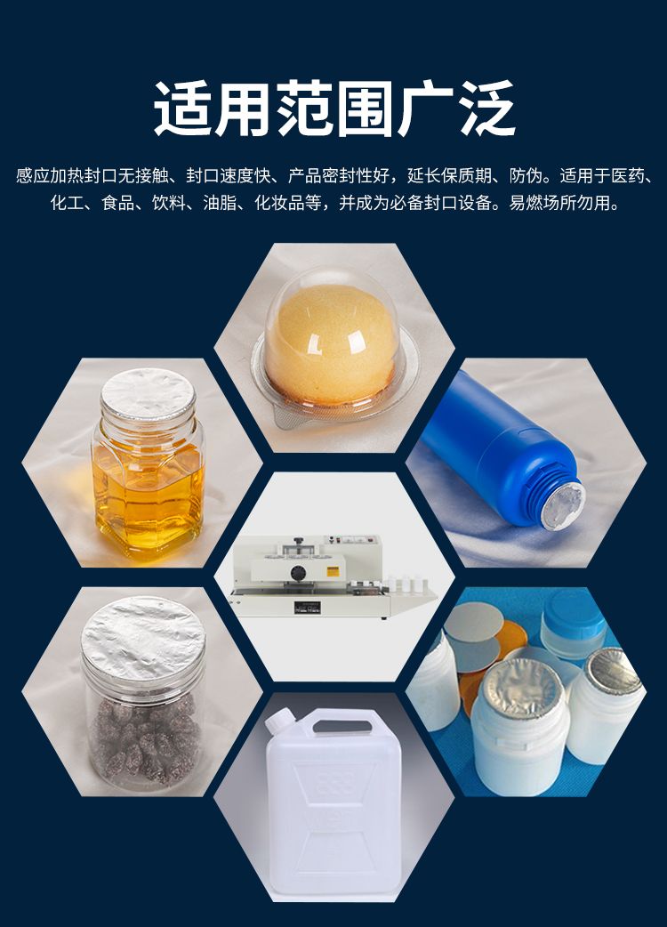 感应加热封口无接触,封口速度快,产品密封性好,延长保质期,防伪。适用于医药,化工,食品,饮料,油脂,化妆品等,并成为必备封口设备。易燃场所勿用!使用于环境条件较好,必须在干燥,清洁,无尘,无腐蚀性气体和空气流通的环境中使用,并远离各种热源,不宜长时间在潮湿,酸碱腐蚀严重的环境中工作,会大大缩短设备使用寿命,本金只适用于塑料,玻璃,纸质等容器的封口作业,不适宜金属。