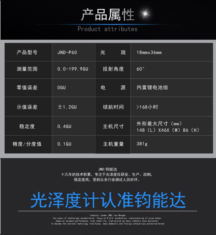 JND-P60光泽度计是参照标准ISO 2813和GB/T9754设计制造的光泽度测量仪器.技术参数符合ASTM D2457、ASTM D523及GB/T13891 GB/T7706、GB/T8807标准中的规定。各项性能指标达到标准JJG 696《镜像光泽度计和光泽度板》计量检定规程中一级工作机要求。 仪器光泽量值可溯源自上海市计量测试技术研究院(SIMT)的光泽度。