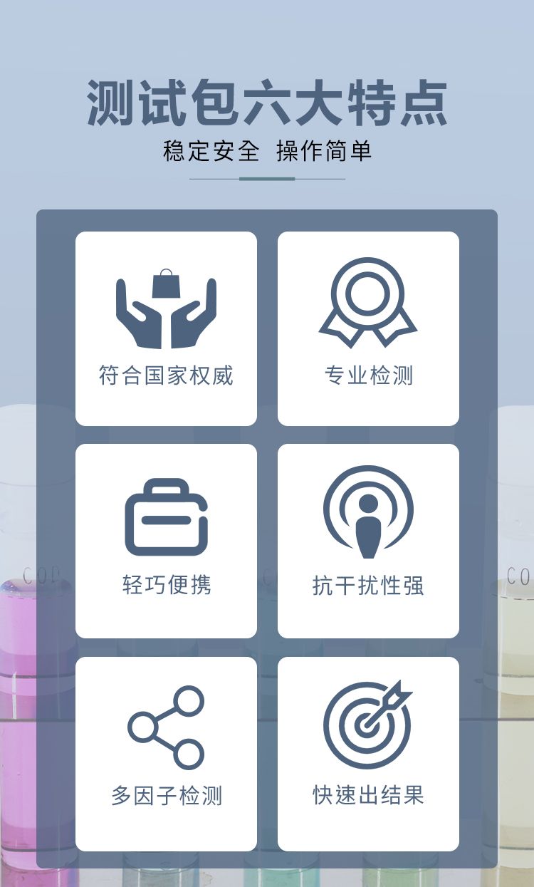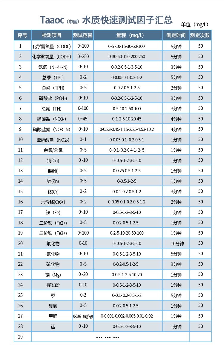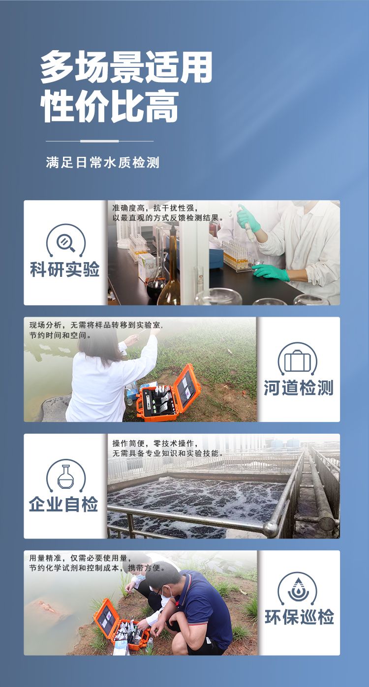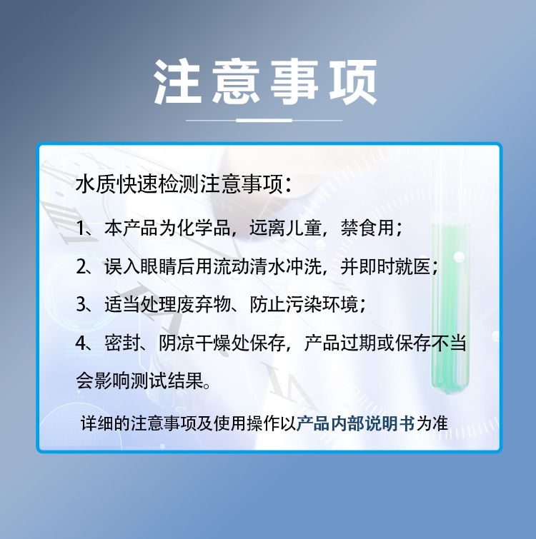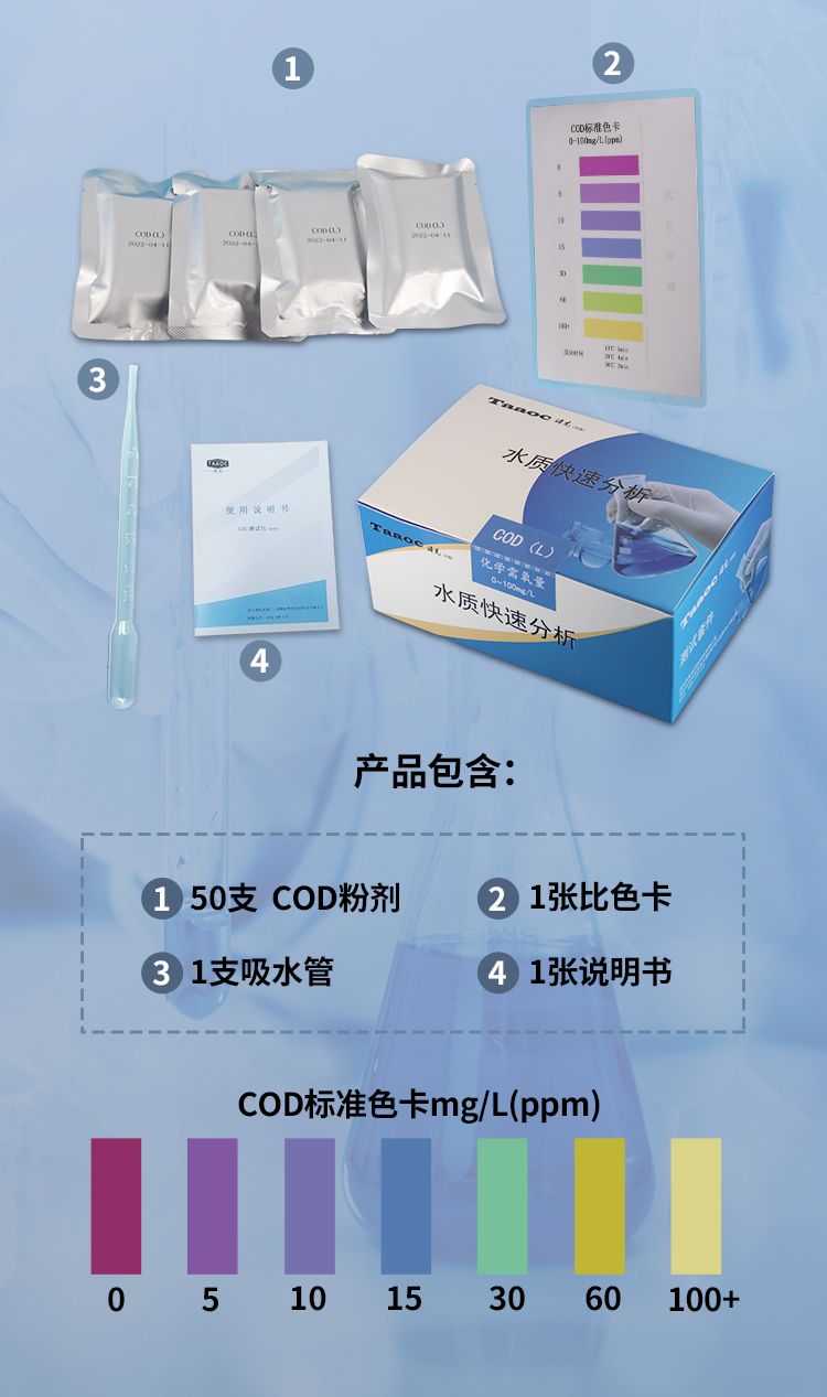 涛克水质快速检测COD测试包可快速测定水中的COD含量,小巧、便捷,便于携带,无论您是在生产现场进行快速测定,还是在户外进行快速排查,测试包均能满足您的水质检测使用需求。涛克水质快速检测COD测试包集成了水质分析领域成熟技术,整个操作流程简单、快速,检测结果稳定可靠。 应用领域: 1、科研实验:准确度高,抗干扰性强,以最直观的方式反馈检测结果; 2、河道检测:现场分析,无需将样品转移到实验室,节约时间和空间; 3、企业自检:操作简便,零技术操作,无需具备相关知识和实验技能; 4、环保巡检:用量准确,仅需必要使用量,节约化学试剂和控制成本,携带方便。 产品优势: 1、符合国家标准; 2、轻巧便携,随时随地操作; 3、项目仅需约几分钟时间,可快速得出结果; 4、产品采用环保材料制成,环保耐用; 5、整体投入小,成本实惠。 注意事项: 1、本产品使用少量化学药品,使用前请认真阅读说明书; 2、远离儿童,不可食用; 3、误入眼睛时及时用流动清水冲洗10分钟,并即时就医; 4、使用完适当处理废弃物、防止污染环境; 5、密封、阴凉干燥处保存,产品过期或保存不当会影响测试结果。 贮存方法: 干燥阴暗处常温保管。 质保期: 本产品有效期12个月,开袋后请尽快使用,如发现药剂变色请慎用,本产品的规格可能在没有预告的情况下变更。 |
