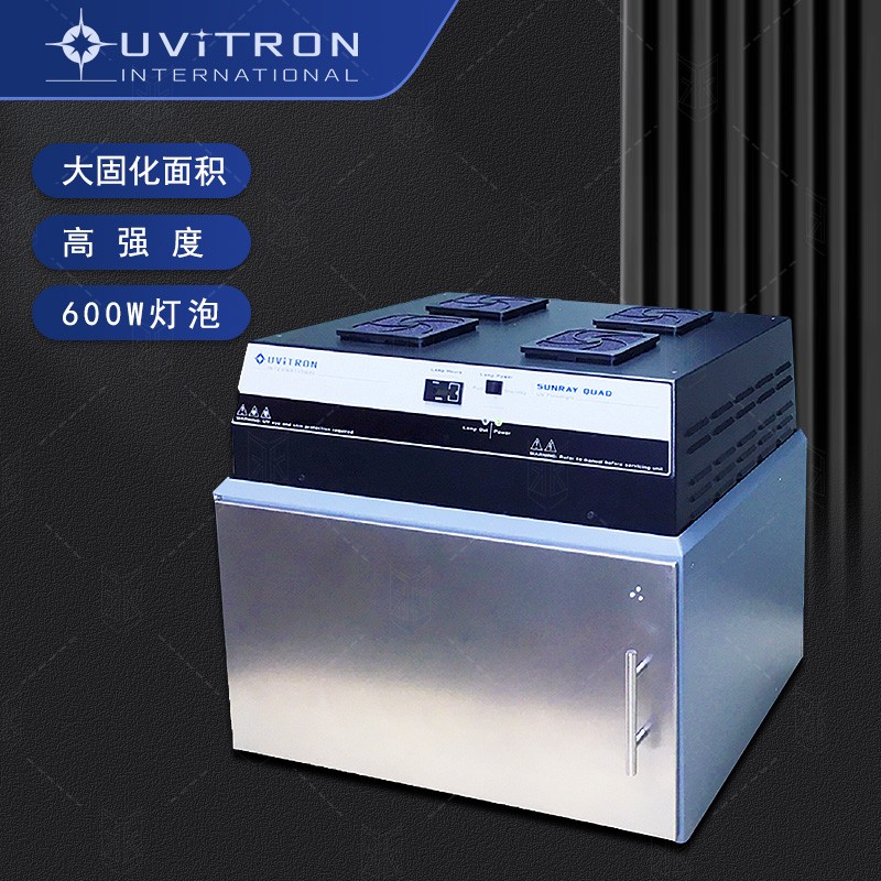SUNRAY QUAD是**研发的经济型四灯紫外光源固化机,具有SunRay_UV固化机的全部功能,单具备更大的固化面积和均匀光照强度4支长寿命600W金属卤化灯和抛物面发射罩,可以有效照射40*30平方厘米的固化面积,光强分部均匀,适合较大面积的产品固化,可以放在流水线、固化箱上做长时间的固化。